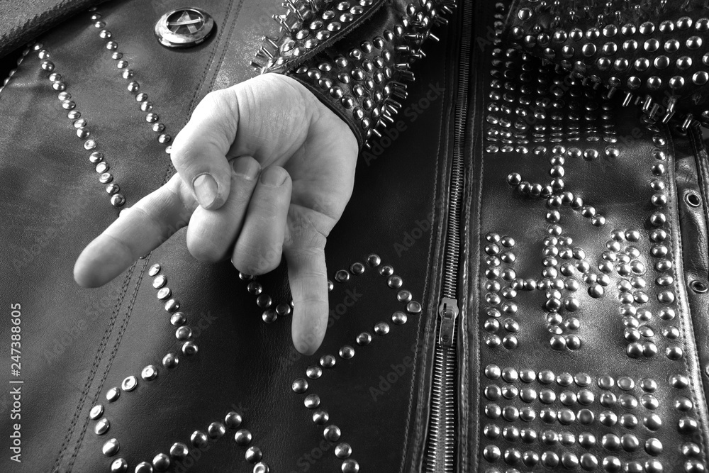 Hand of rocker in leather bracelet.Rock & roll, heavy metal,gothic,punk,horns sign and fist.Hard style.Rivets accessories