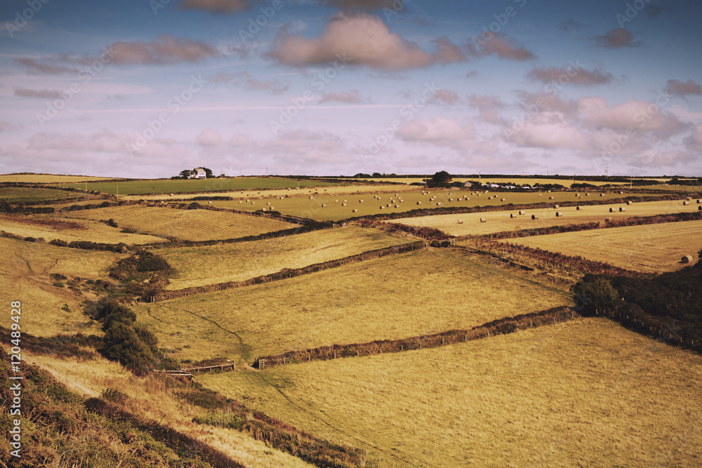 Cute small French Bulldog dog with gold and black new year party hat on head lying on white background