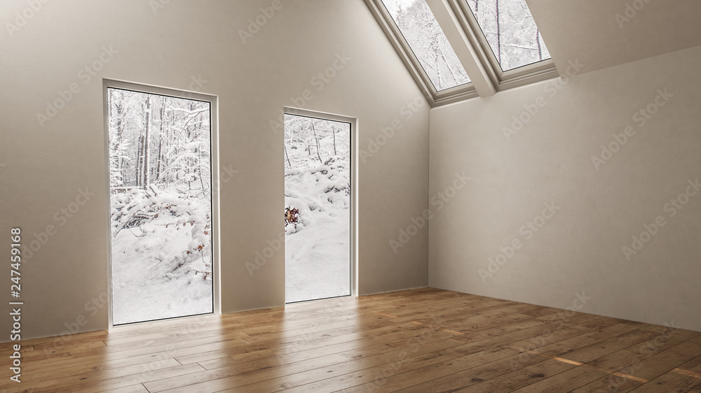 Leeres Zimmer mit großer Fensterfläche und hellem Holzfußboden und Dachflächenfenster
