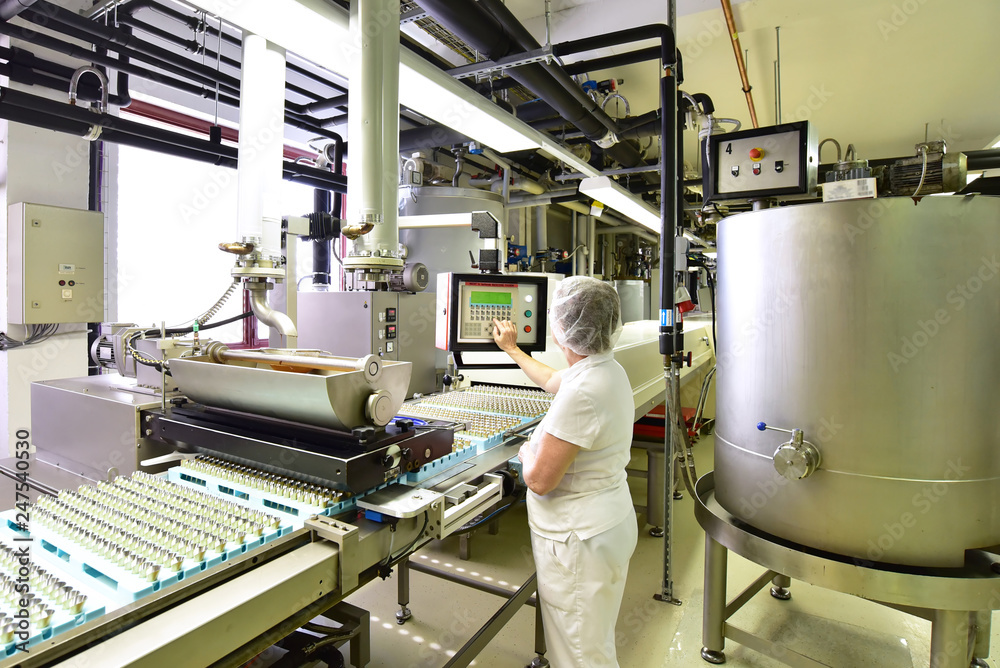 Frau bedient Maschine in der Lebensmittelindustrie - Fliessband mit Pralinen in Fabrik Automatisierung // Woman operates machine in food industry - assembly line with chocolates in factory automation
