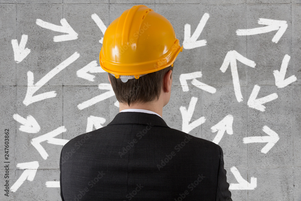 Bauleiter mit Helm vor Wand mit weißen Pfeilen
