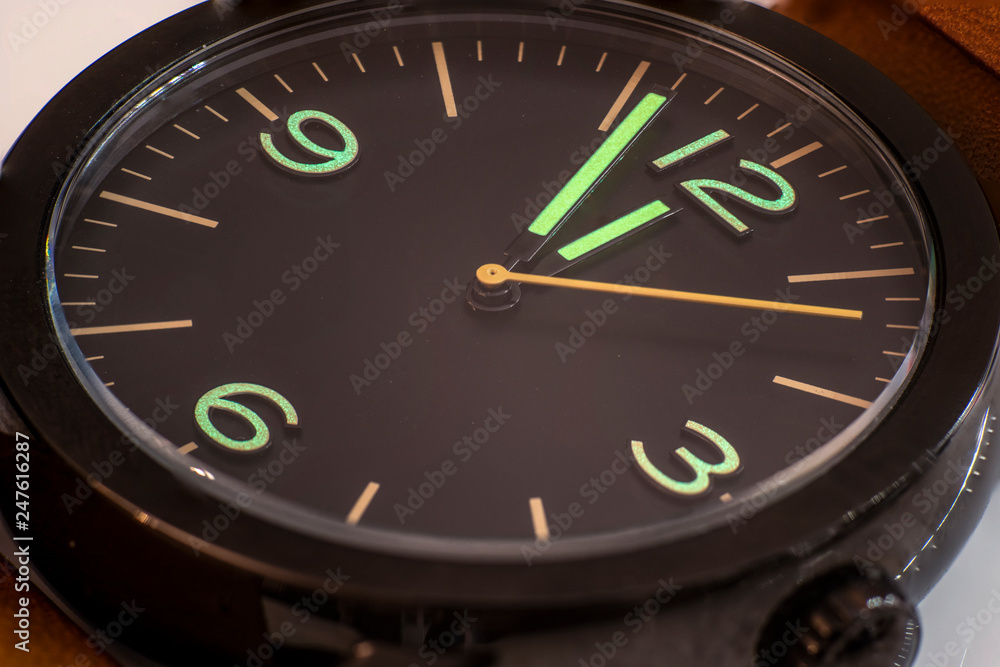 Armbanduhr mit floureszierendem Ziffernblatt und Zeigern um kurz vor 12