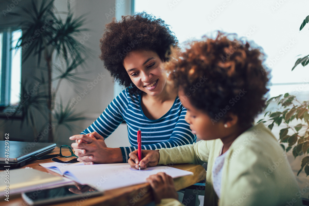 Mother and daughter doing homework learning to calculate