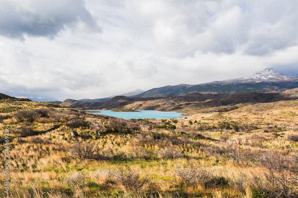 The blue waters of Lake Pehoe in Torres del Paine National Park Chile