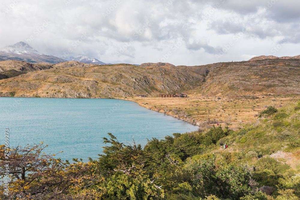 The blue waters of Lake Pehoe in Torres del Paine National Park Chile