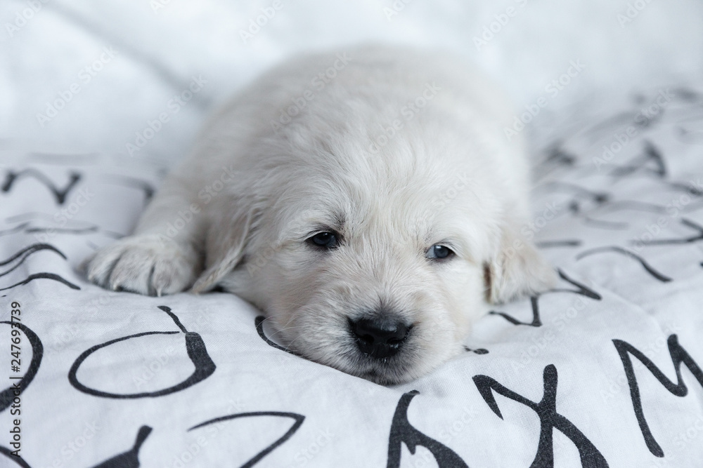 little puppy golden retriever lying on the bed shee