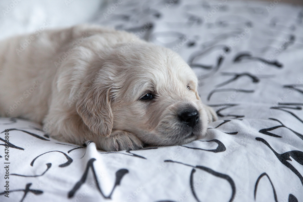 little puppy golden retriever lying on the bed shee