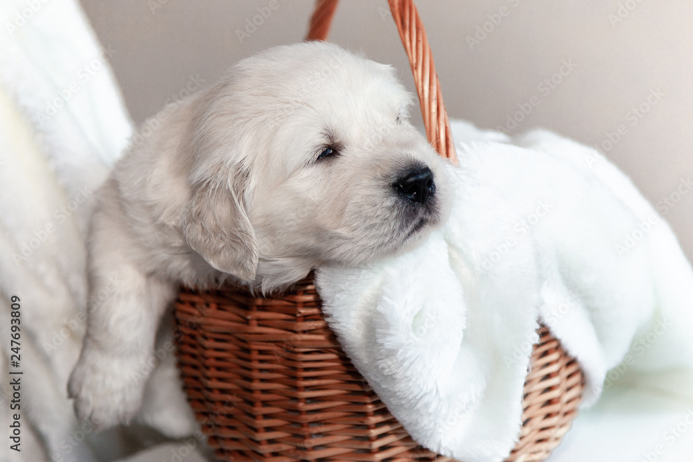 the little puppy of a golden retriever is lying in a basket on a soft fur plaid
