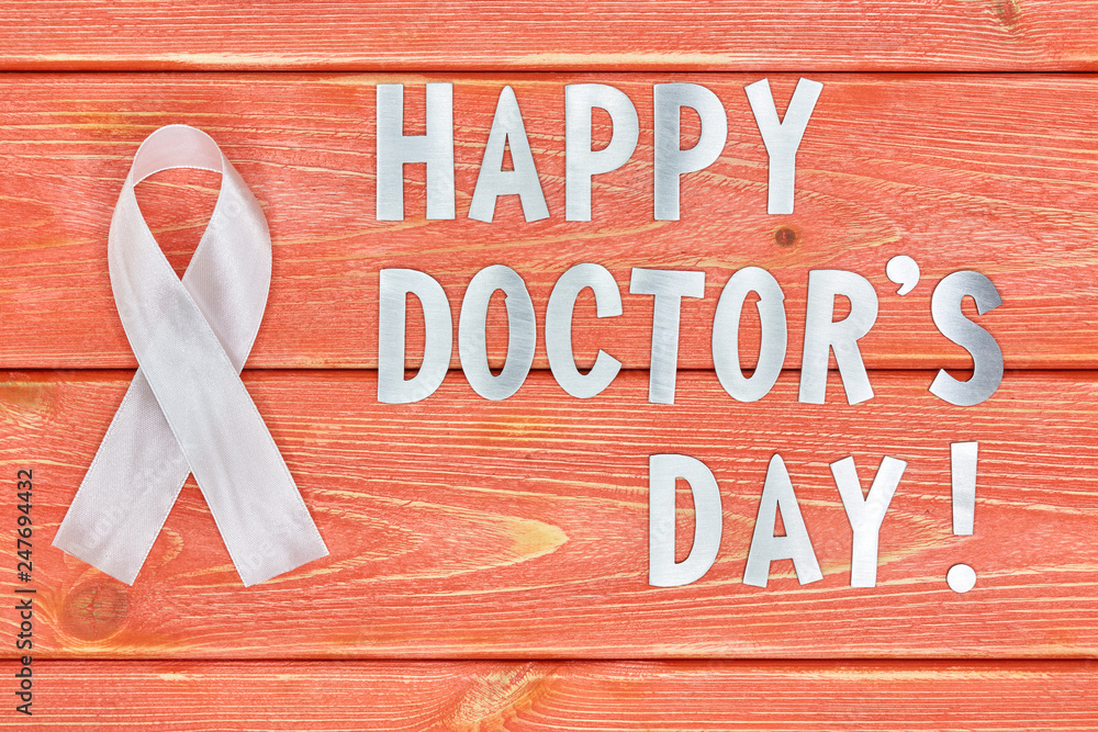 white awareness ribbon and inscription of iron letters: Happy doctors day. lying on wooden textured background color of season 2019