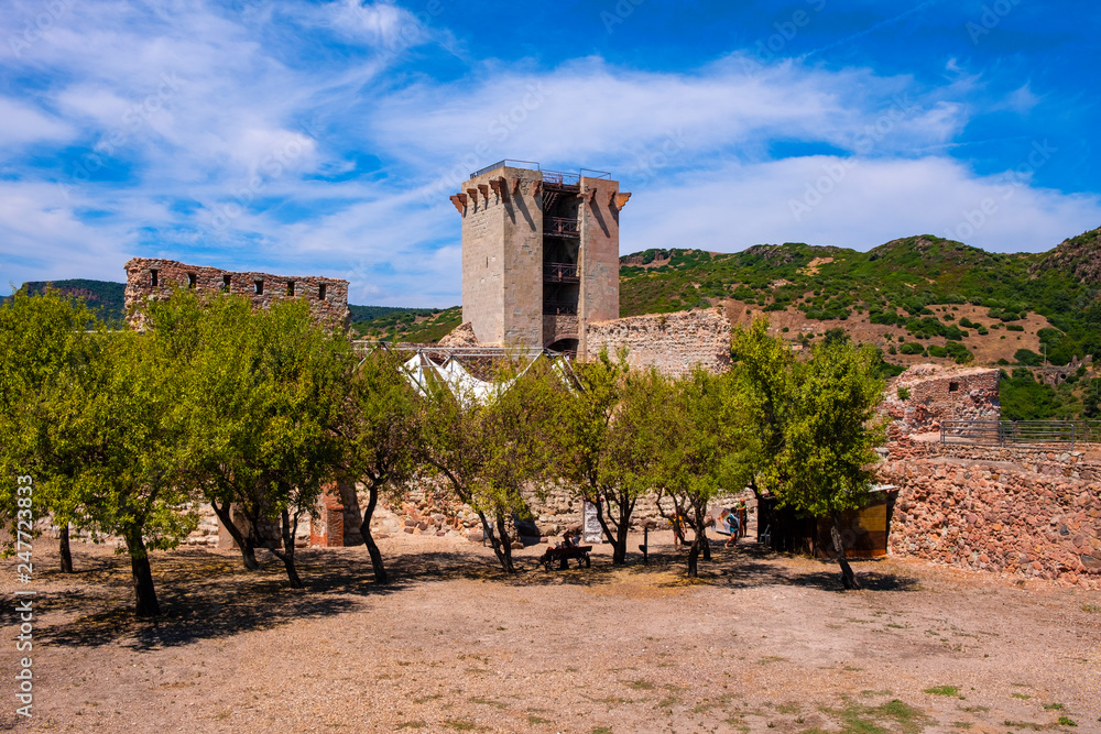 Bosa, Sardinia, Italy - Main tower - Torre Maestra - of the Malaspina Castle, known also as Castle of Serravalle, with monumental historic defense walls and fortification