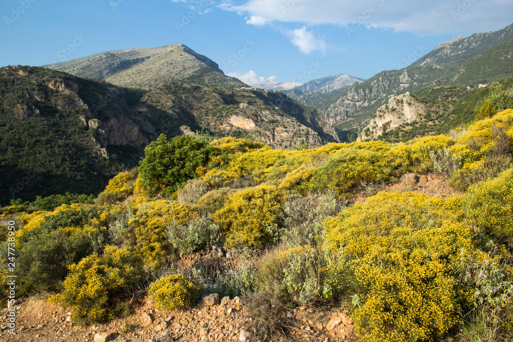 Landschaft mit blühendem gelben Ginster auf der Halbinsel Mani, Griechenland mit Bergen im Hintergrund