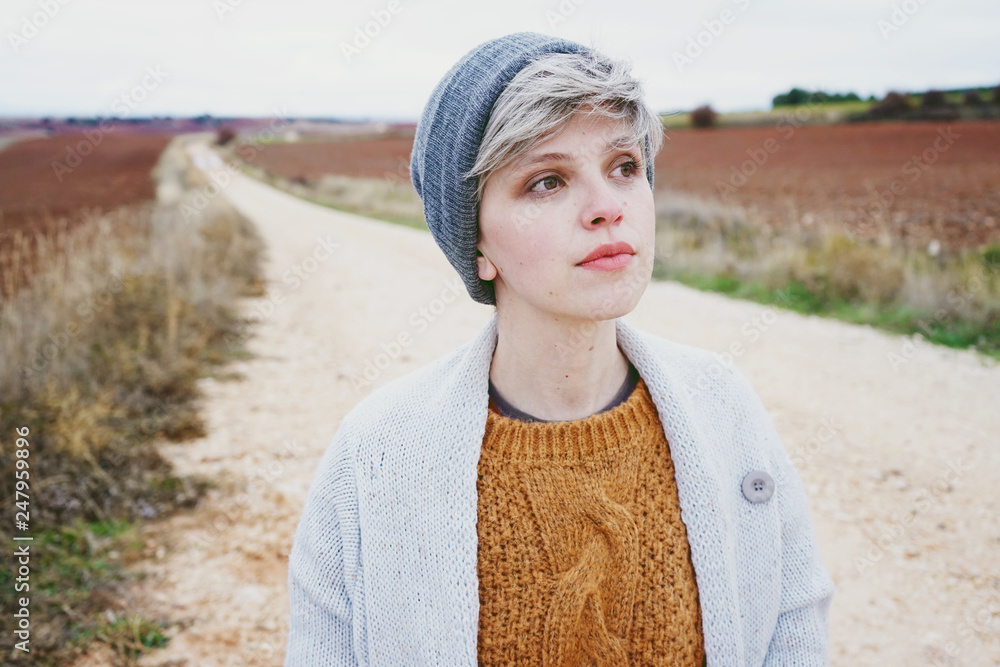 Woman with short and gray hair is alone in the beggining of a rural path in a cold autumn day