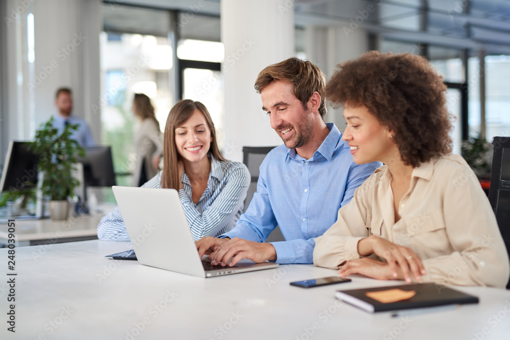 Coworkers sitting at table and solving problem. Man using laptop while two female colleagues looking at laptop and helping him..