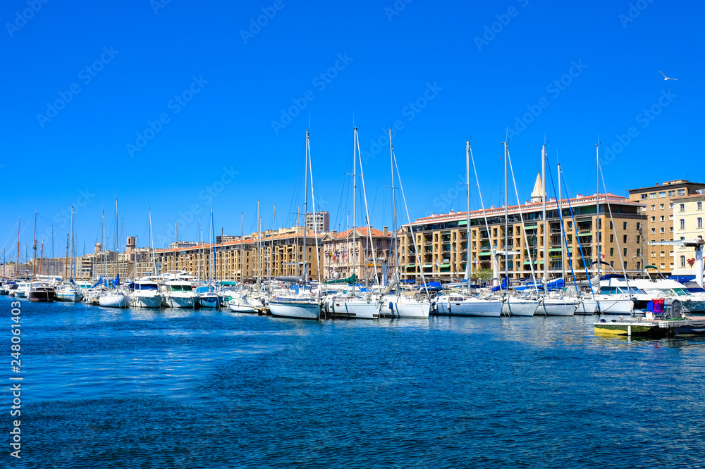 Panoramic view of the right embankment of Old Port of Marseille. Vieux-Port de Marseille, France.