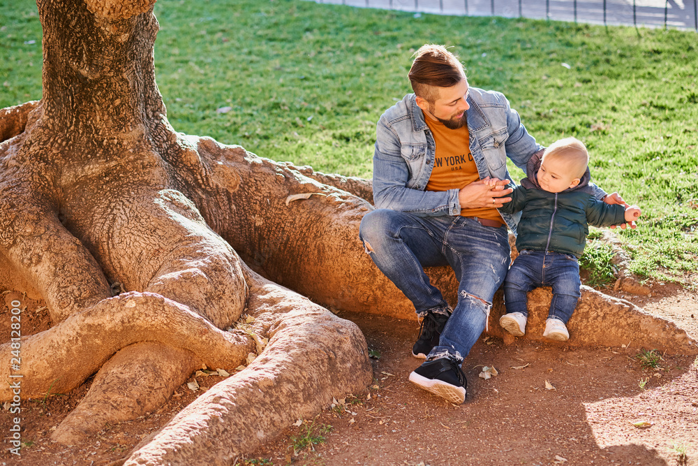Happy young father walking with his little son