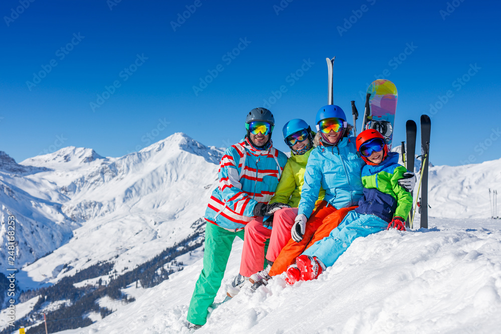 Family enjoying winter vacations in mountains . Ski, Sun, Snow and fun.