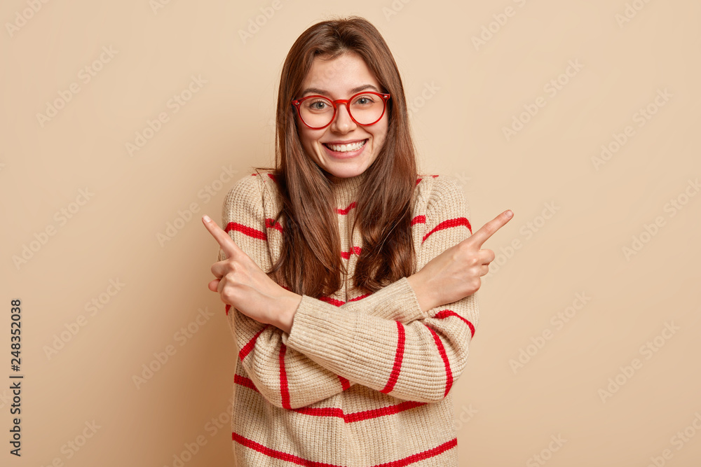 Happy smiling European girl crosses hands over chest, points at different empty corners, makes choice, feels joyful, dressed in casual sweater, isolated over beige background. What to choose I wonder