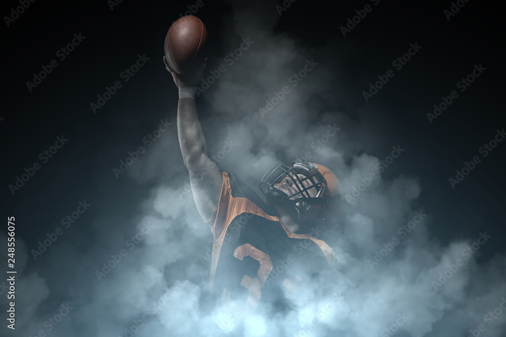 American football player on a dark background in smoke in black and orange equipment.