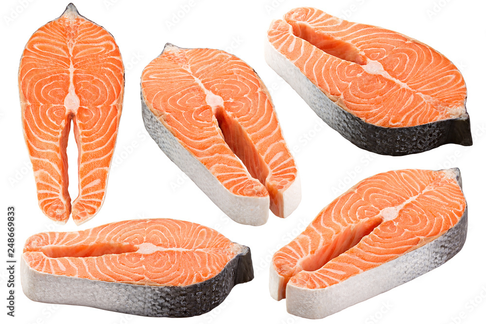 salmon, trout, steak, slice of fresh raw fish, isolated on white background, clipping path, full depth of field