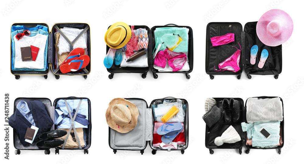 Set of different suitcases packed for travelling on white background, flat lay
