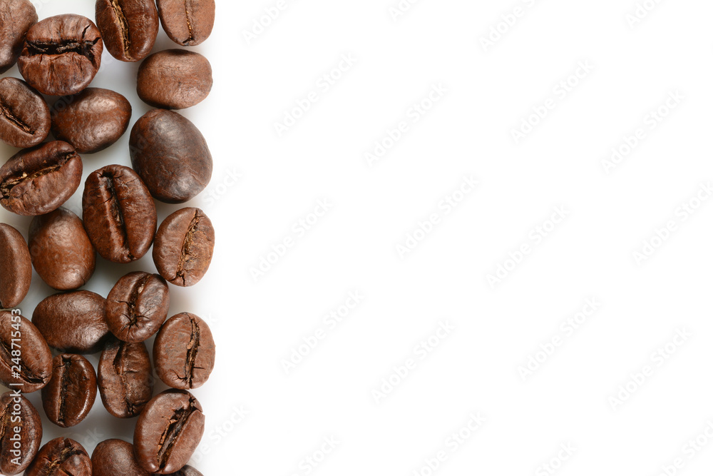 Coffee beans. Some hard roasted coffee beans, close up macro, isolated on white background with copy space on right.