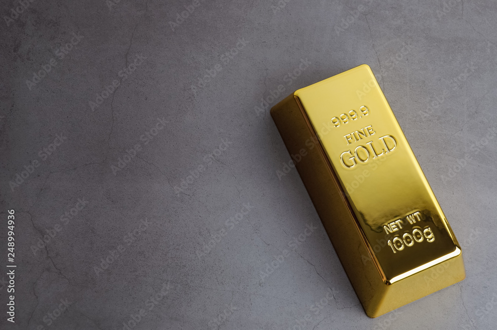 An ingot of gold metal bullion of pure brilliant diagonally located on a gray textured background.
