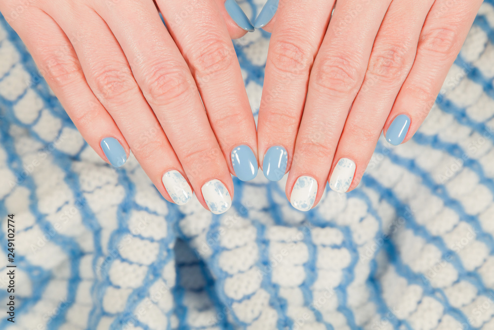 Closeup top view of female fingers with two colors manicure of blue and white colours. Hands of young woman isolated on cozy warm blanket. Horizontal photography.