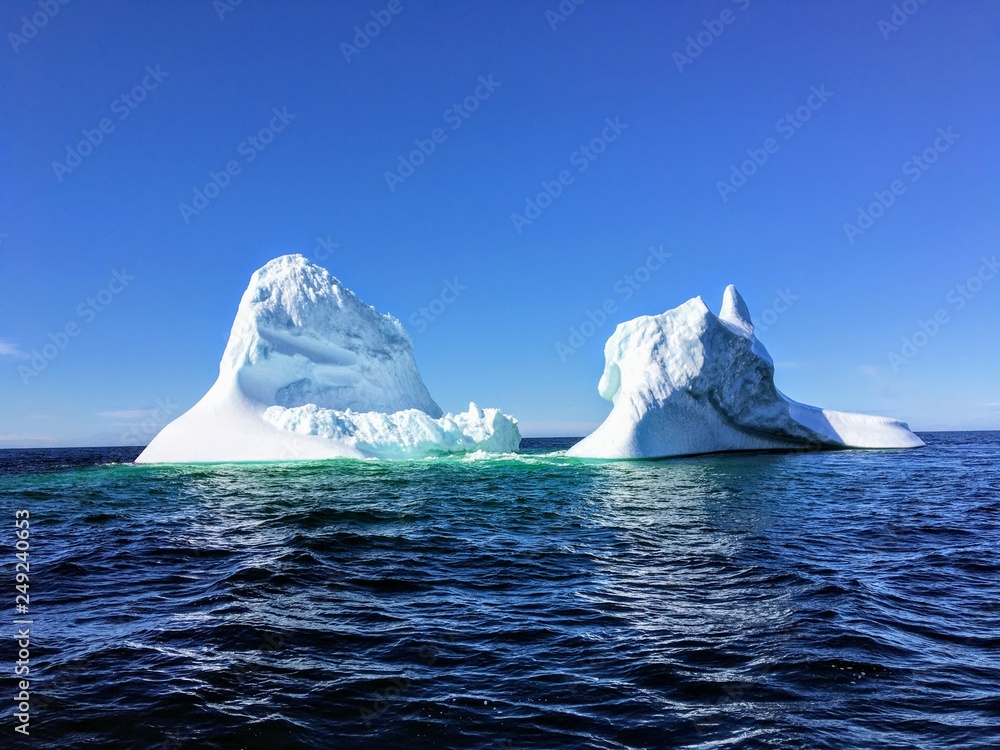 A massive iceberg floating off the coast of Twilingate, Newfoundland and Labrador, Canada. The iceberg floats in the vast open ocean and flowed down from the arctic.
