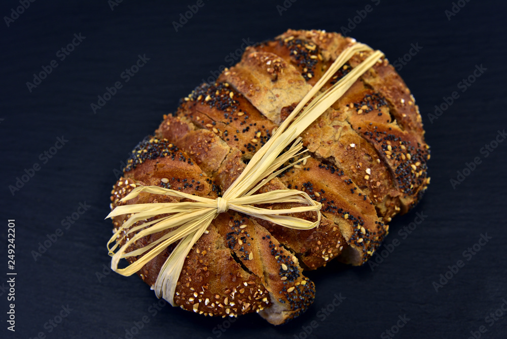 Vollkornbrot in Scheiben auf Schiefertafel