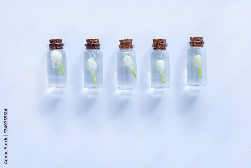 Essential oil with jasmine flower on white background.