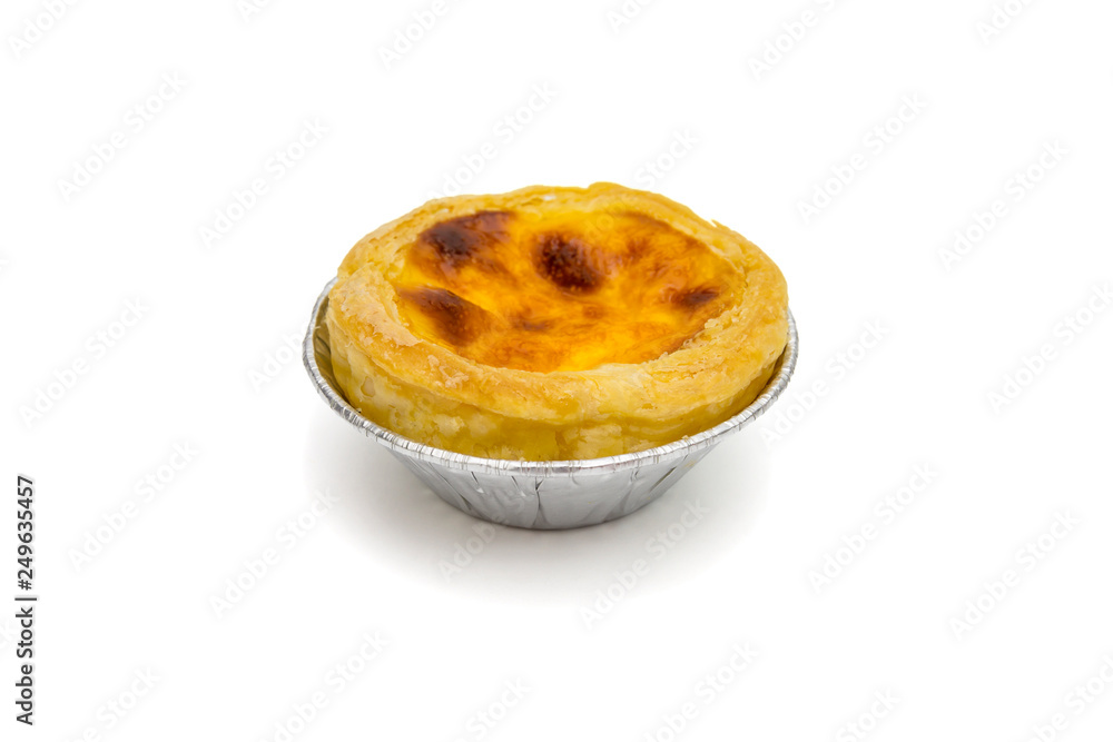 egg tart in aluminum foil cup isolated on white background