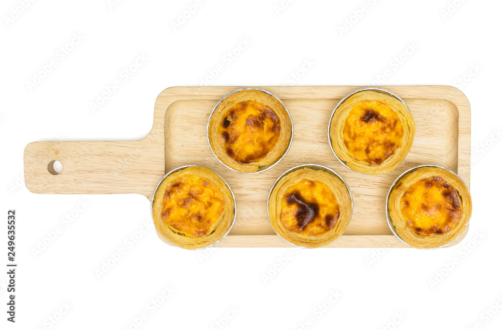 egg tart in aluminum foil cup on square wooden tray, isolated on white background, top view