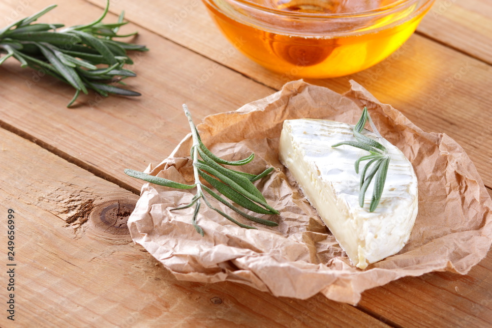 Camembert with rosemary branches on wooden boards. Soft cheese on parchment paper. Cheese with and honey on wooden background