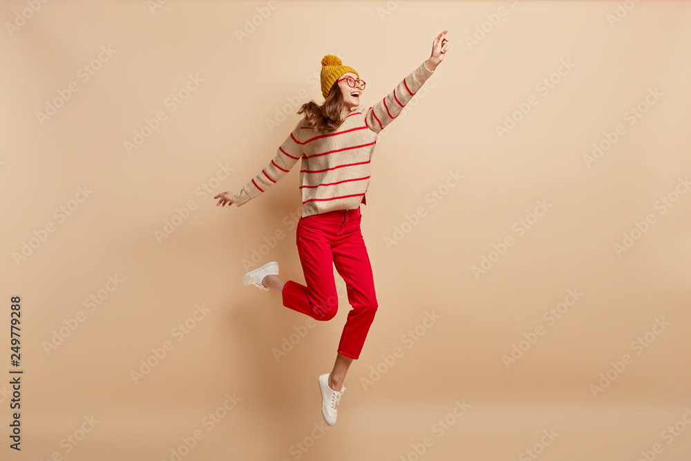 Isolated shot of overjoyed carefree girl jumps high, spreads hands, smiles happily, looks upwards, wears hat with pompon, sweater and red trousers, photographed in motion over beige studio wall
