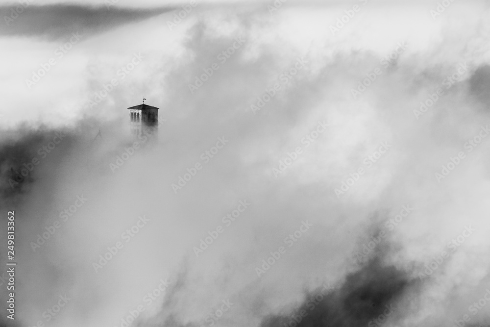 A view of St.Francis church in Assisi (Umbria, Italy) barely visible in the middle of fog