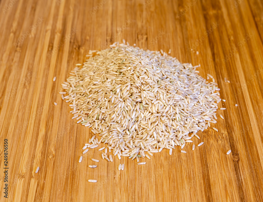 Uncooked brown rice on a wood cutting board