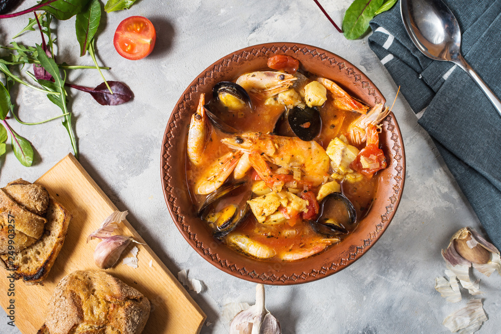 French fish soup Bouillabaisse with seafood, salmon fillet, shrimp, mussels on concrete background. Delicious dinner