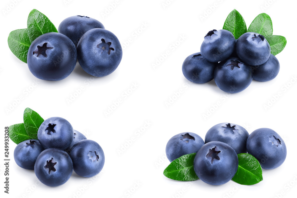 fresh blueberry with leaves isolated on white background closeup. Set or collection