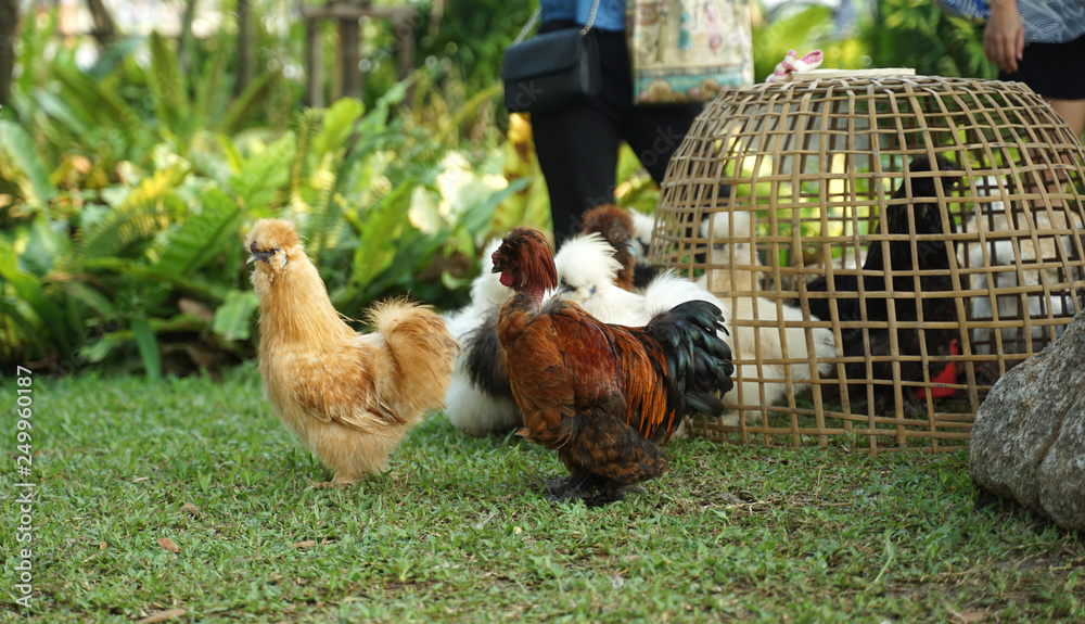 Fluffy Silky chicken walking on the grass