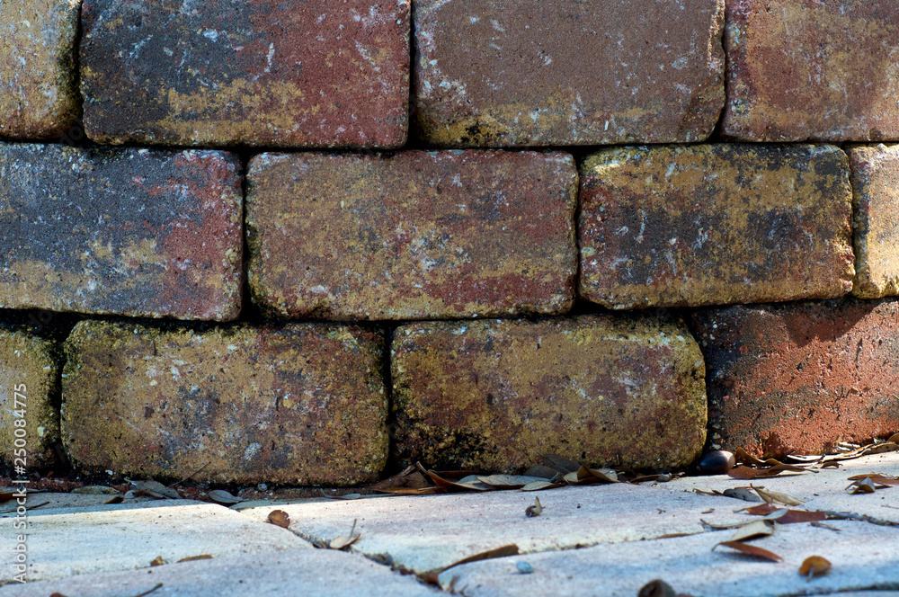Eye level close up of curved brick wall, showing base and ground pavers.