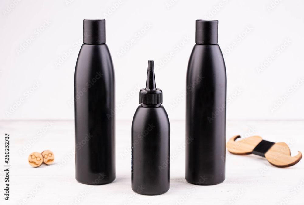 Black bottles from under shampoo, oil and the conditioner with the men accessories