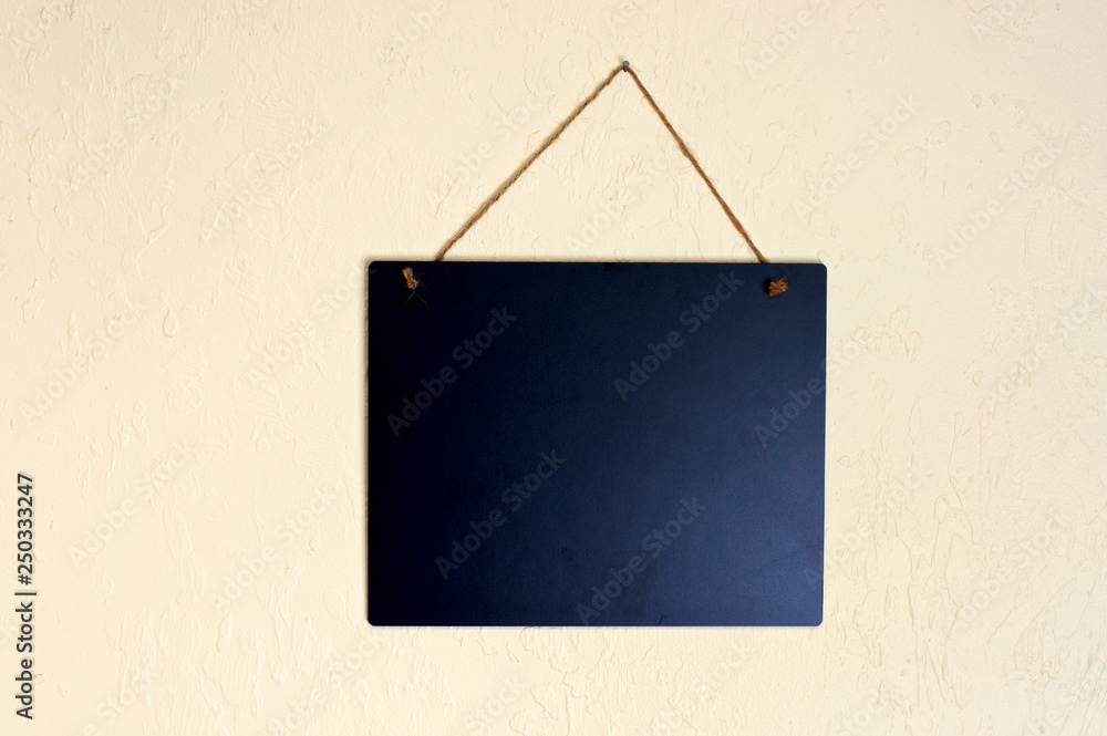 An empty blank black chalkboard hanging on a wall with rope indoors with copy space.