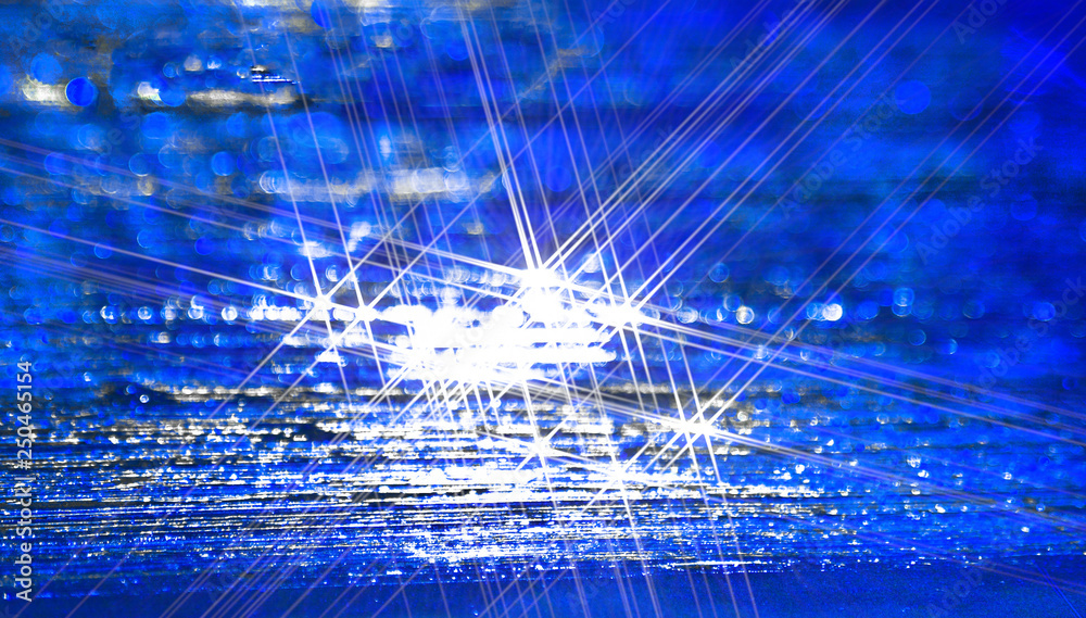 The silver glitter of water droplets on the blue.
