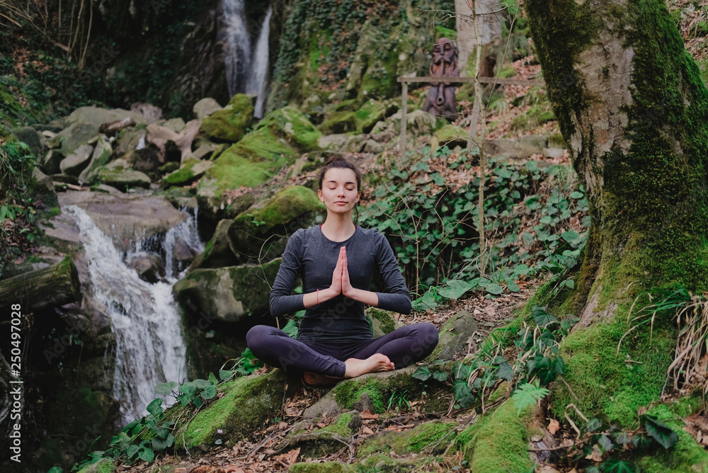 Young slim woman practicing yoga outdoors in moss forest on background of waterfall. Unity with nature concept. Girl meditates sitting