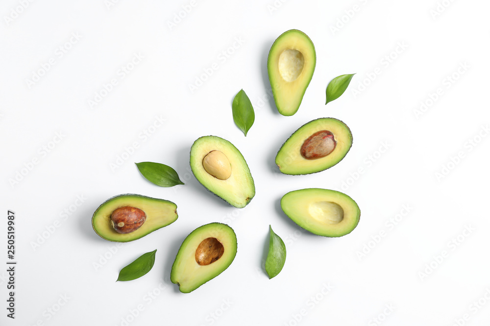 Flat lay composition with ripe avocados on white background, space for text. Top view