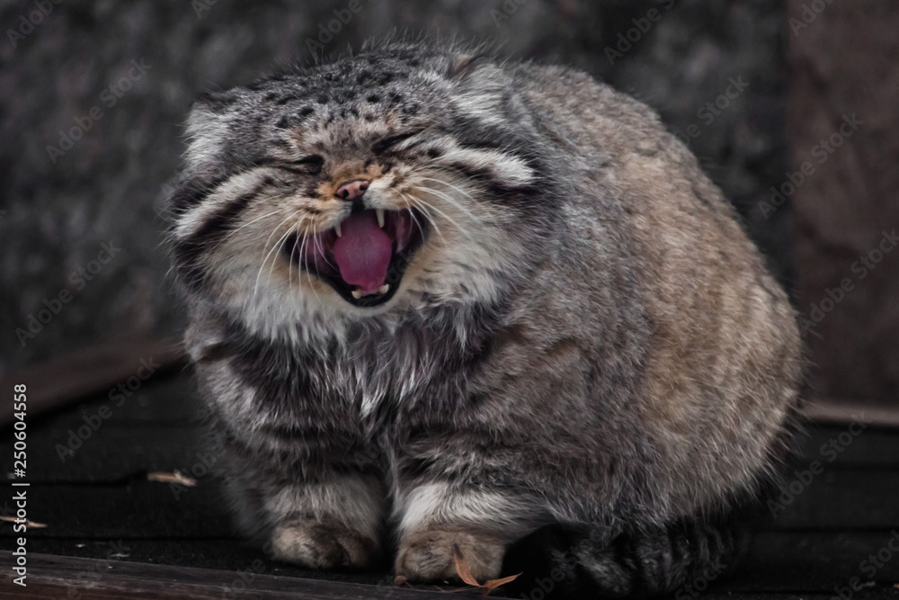 A large and dissatisfied wild cat, Manul, is shouting loudly, opening his red mouth, predatory and evil.