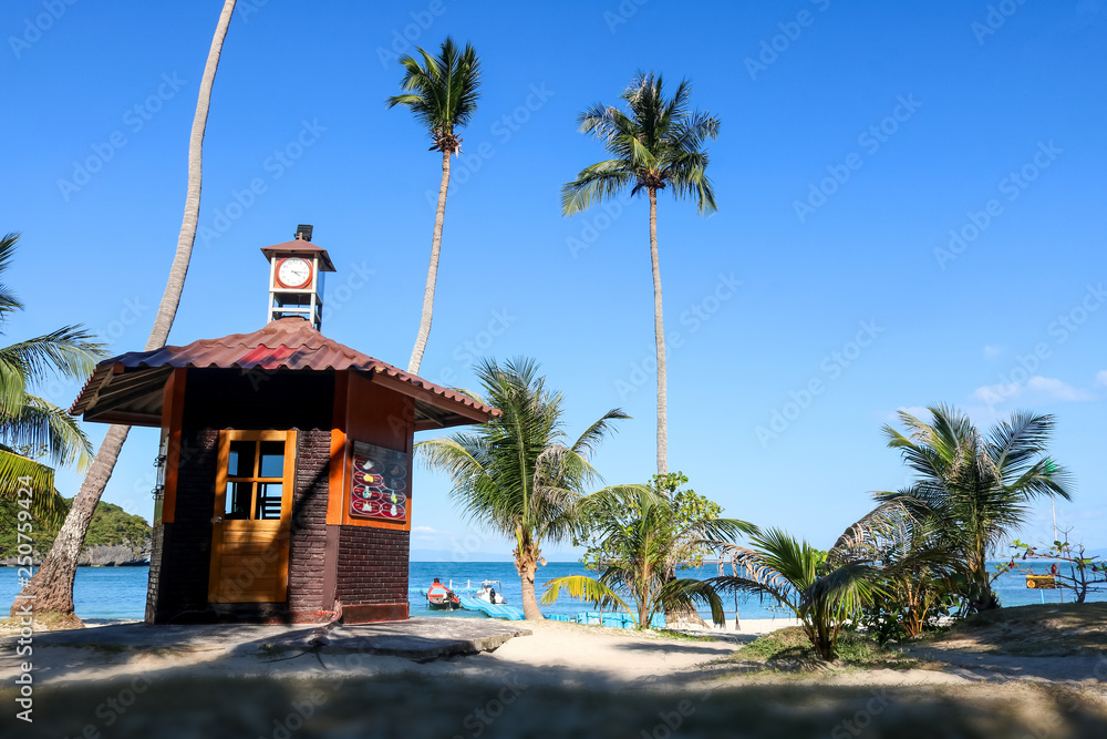 The clock tower on the coconut beach. Lifeguard tower , Hut or Cottage against the blue sky
