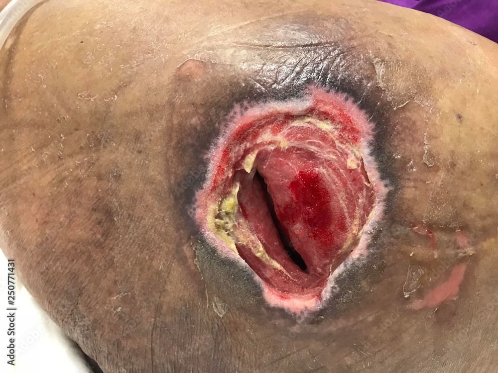 Pressure injury stageIV.Bedsore pressuresore bedridden.HealthCare and Medical Concept.