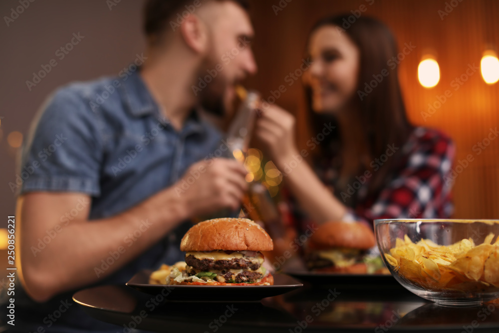 Happy couple having lunch in cafe, focus on burger