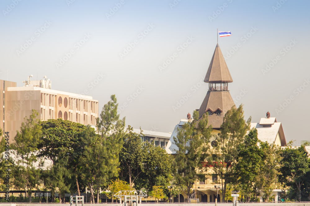 Thammasat University, Tha Pachan campus view from Chao Phraya River. Thammasat is Thailand's second oldest institute of higher education, established in 1934 near the Grand Palace in Bangkok Old City.